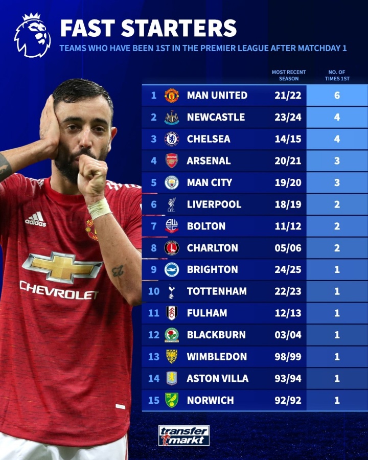 8月15日最新消息,随着英超新赛季即将打响,德国转会市场统计了历届英超首轮后领跑积分榜的球队次数排名,红魔曼联以6次登顶的纪录高居榜首。